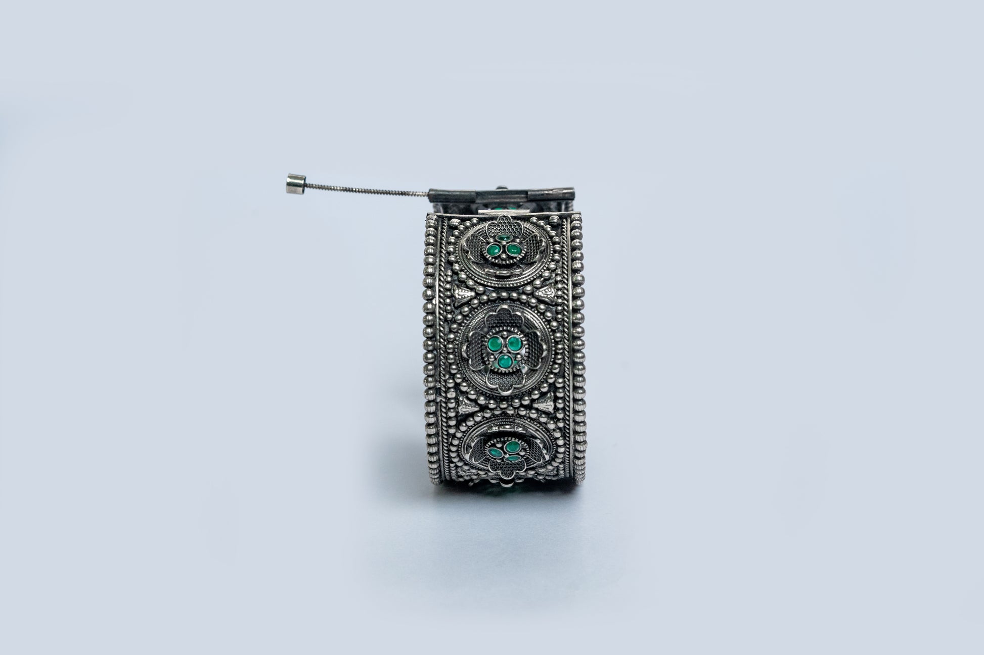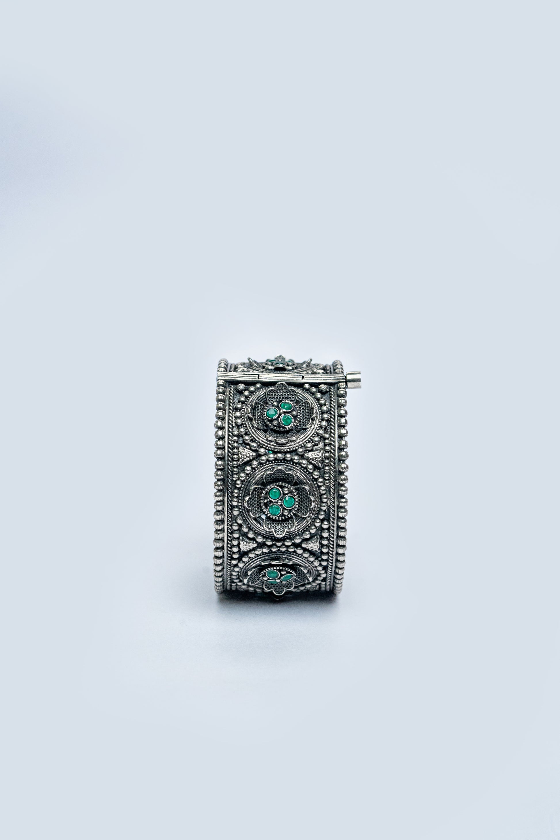 Oxidised kada with an intricate design which is very traditional in nature. The bangle is versatile and adds just the right amount of pretty to your traditional attires.