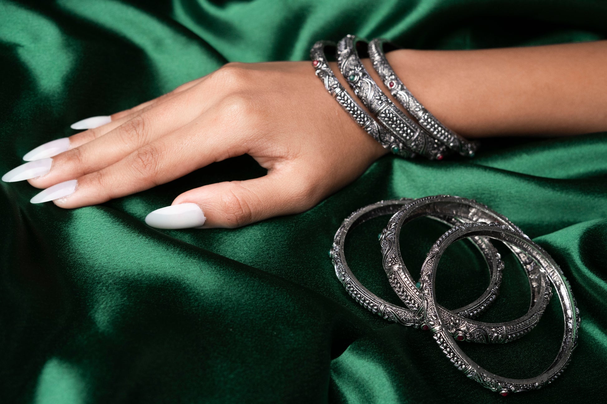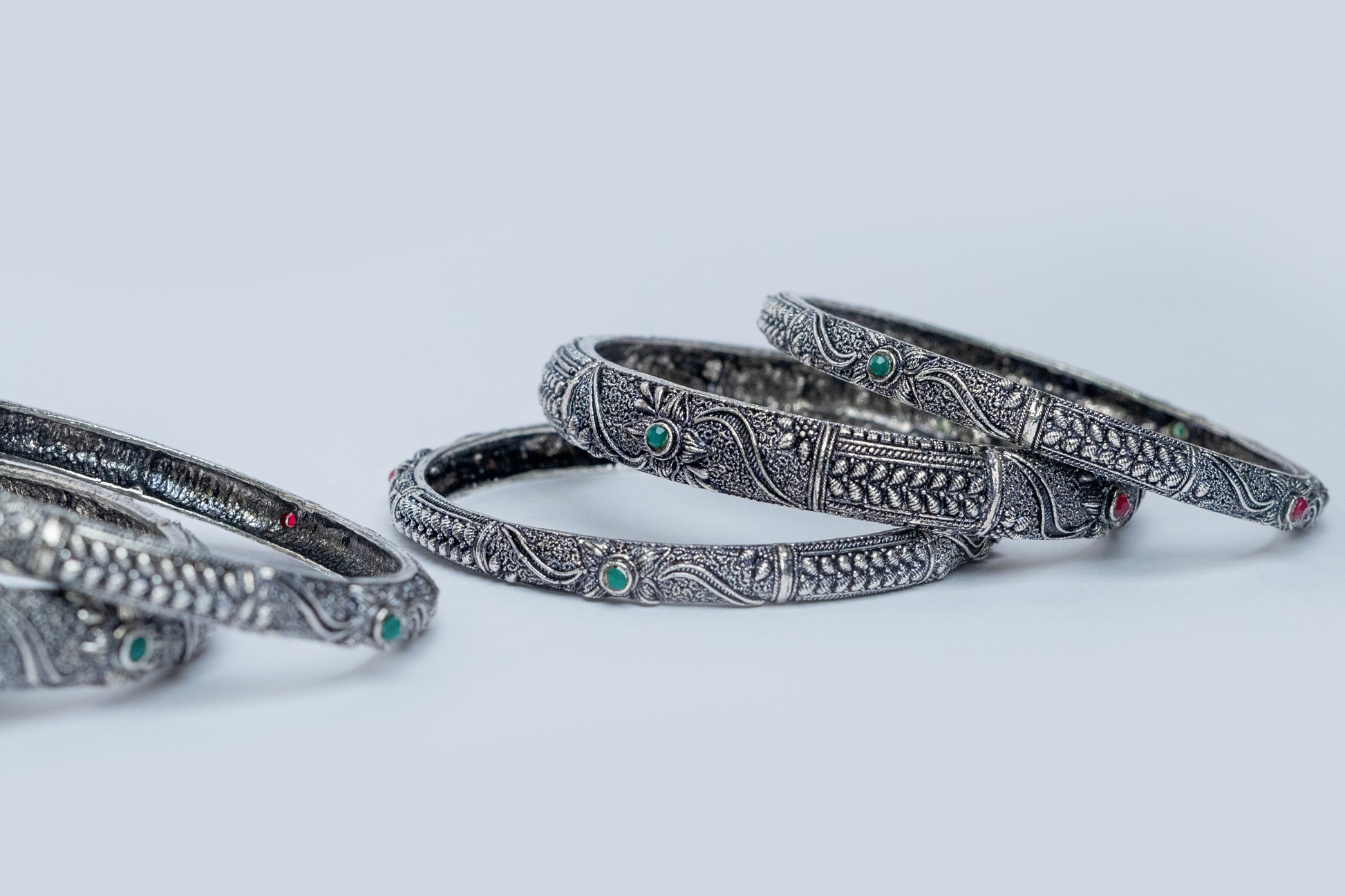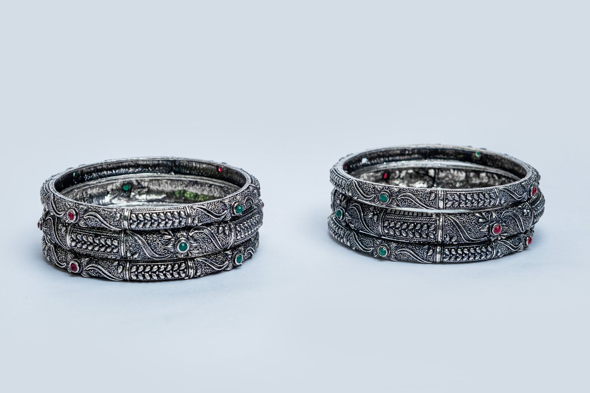 This oxidized set of bangles (Set of 6) is perfect for all ethnic wear. The textured surface and the hue makes it easy to be paired into any look. The red and green stones in it go well with all ethnic wear.