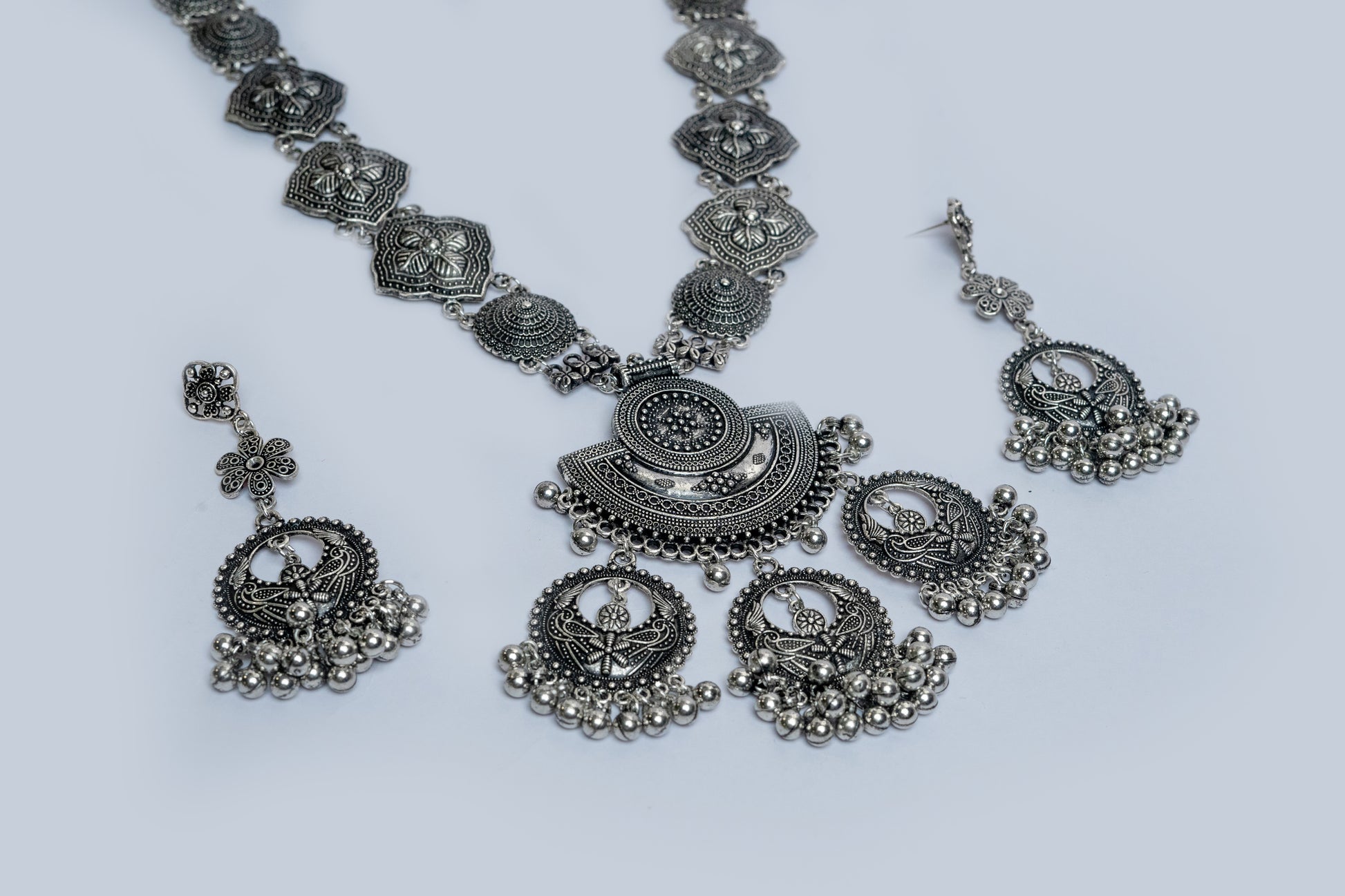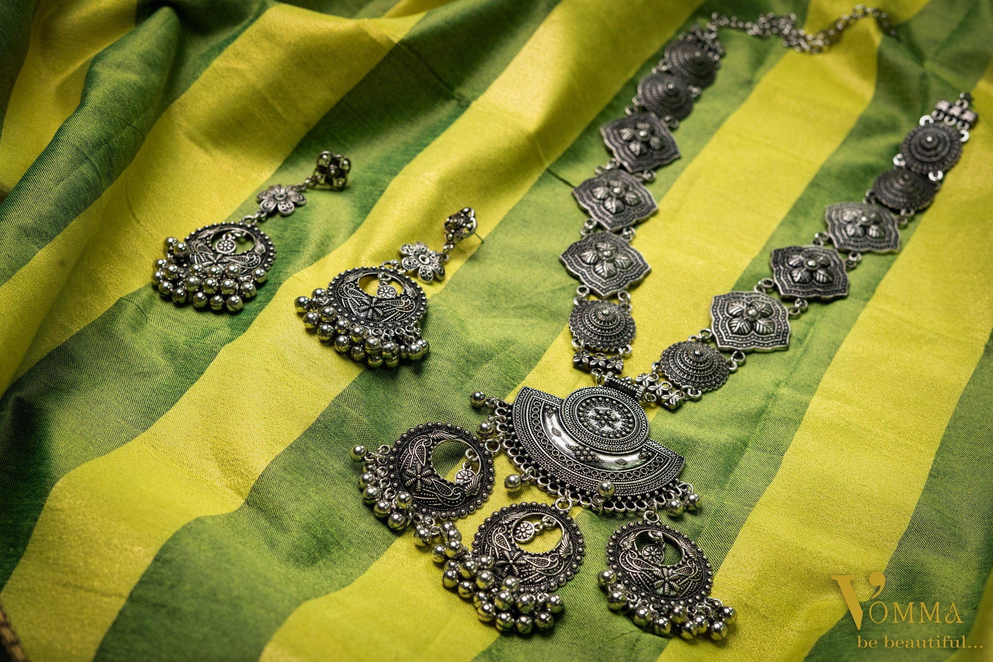 This Vomma Oxidised antique finish necklace & earrings set features a long linked chain balanced with a bold pendant with intricate details and ghungroos by the edge that will give you a royal look. It comes with matching earrings that feature intricate circular motif with ghungroos that complete this grandeur look. This necklace set will shine bright on your silk sarees and will give its dramatic touch to your indo-western outfits.