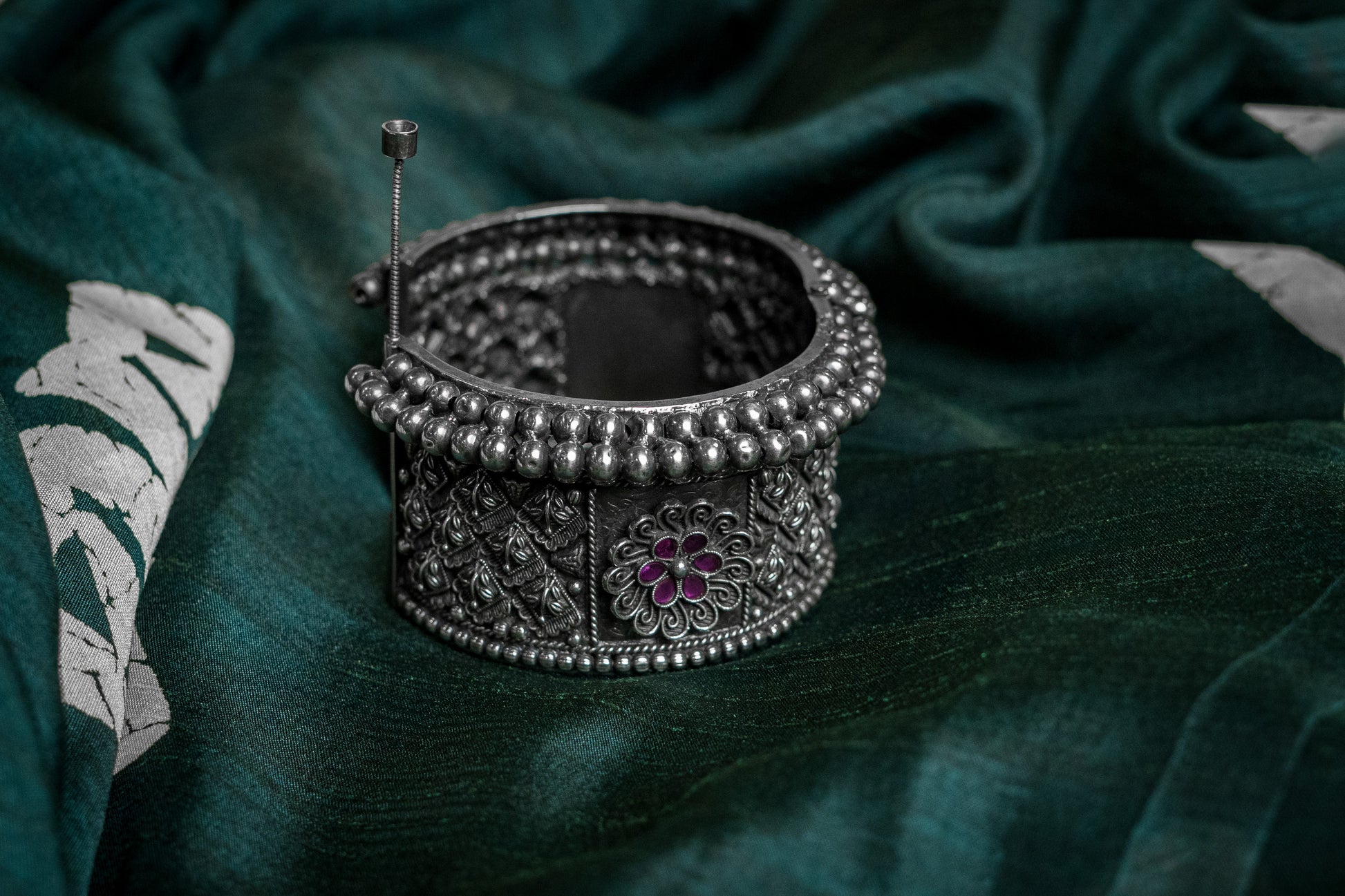 Oxidised kada with floral designs with screw opening. It can be worn single with kurtis and for a bolder appearance, layer and stack with another of the sorts.