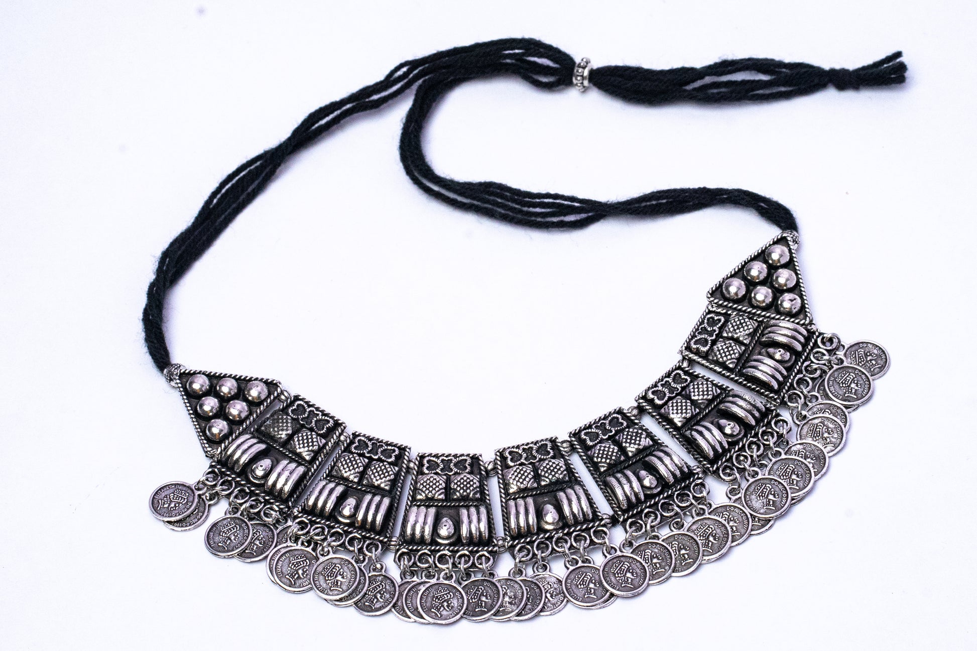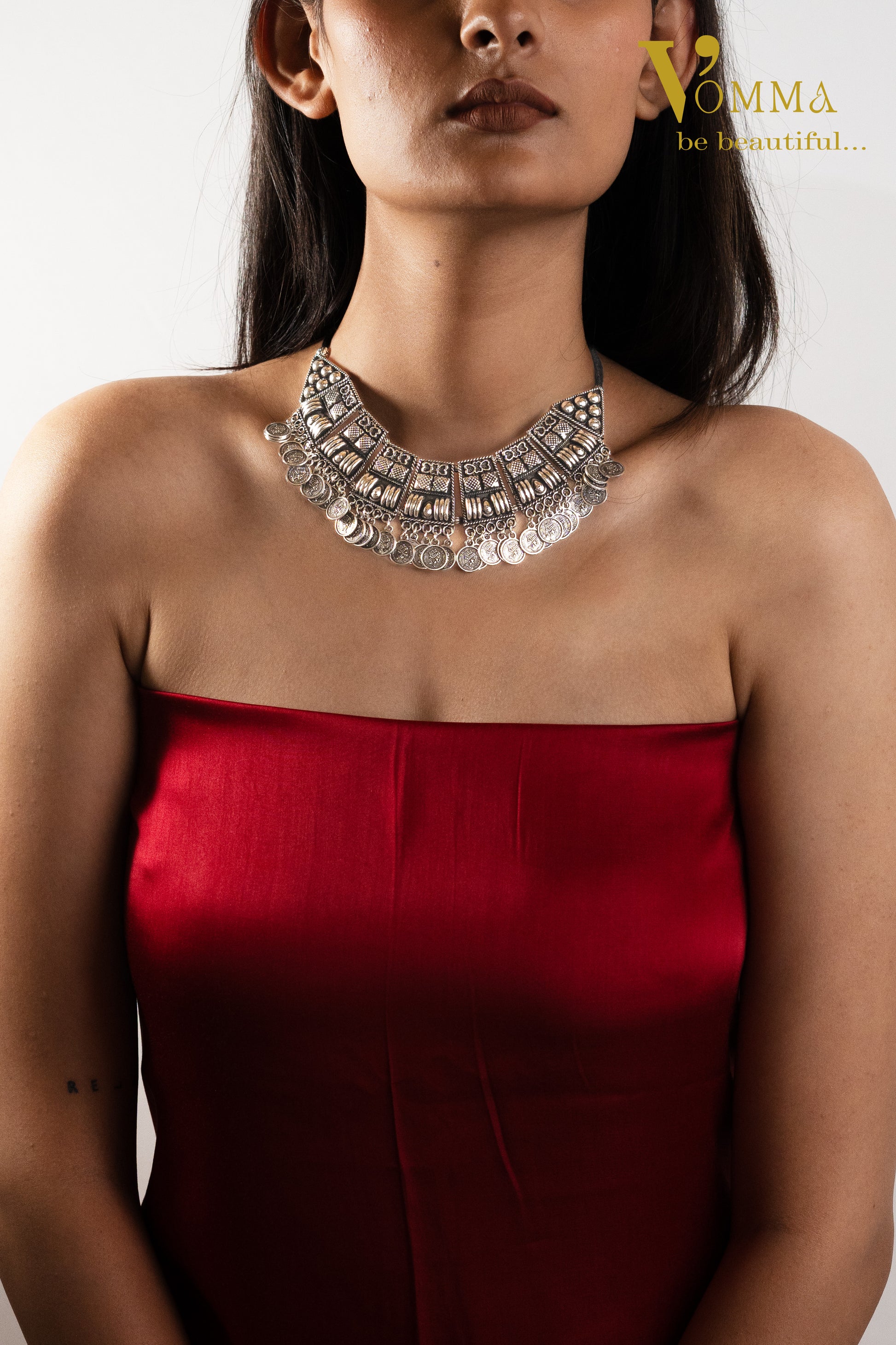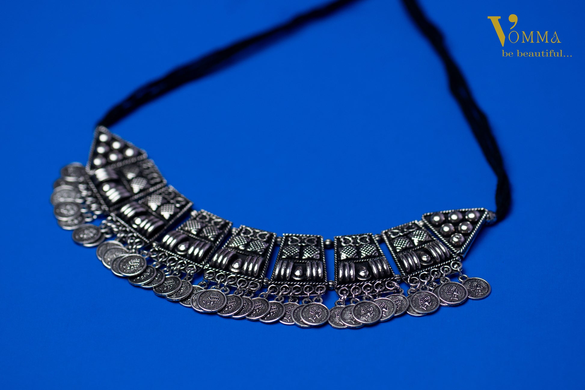 This Vomma Victorian Coin Short necklace is unique addition to your accesories. It goes well with western oufits as well as Indo westerns. Flaunt your style with this unique vomma piece.