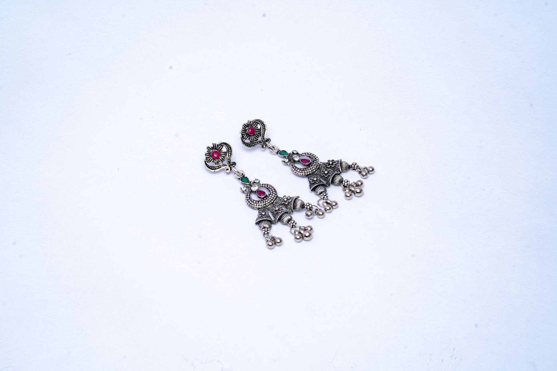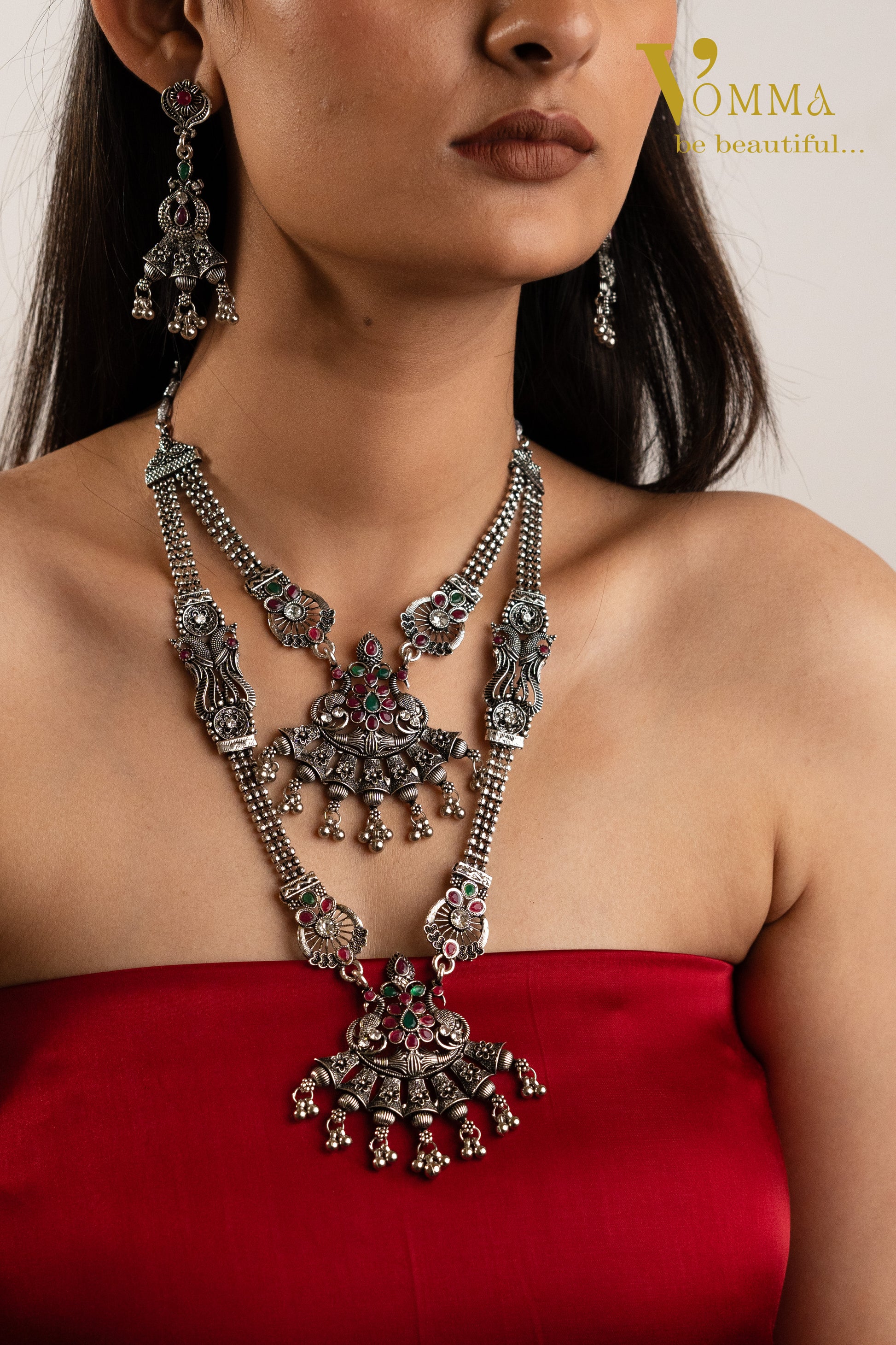 Vomma Double layered Long Necklace with Earrings is a must have set for all your ethnic look needs. This peacock inspired design in necklace & earrings will add traditional yet sophisticated elegance to any outfit. The Red & Green stones in this set adds to the beauty of the set.