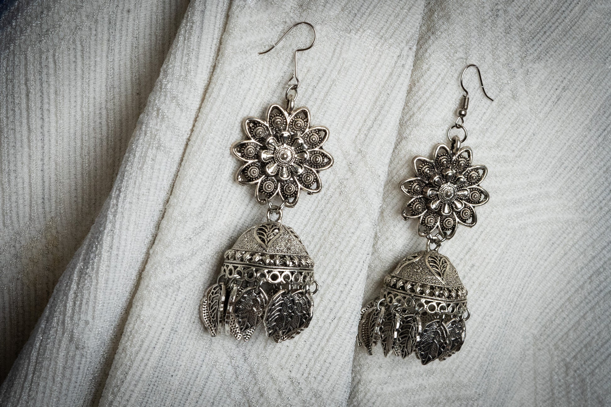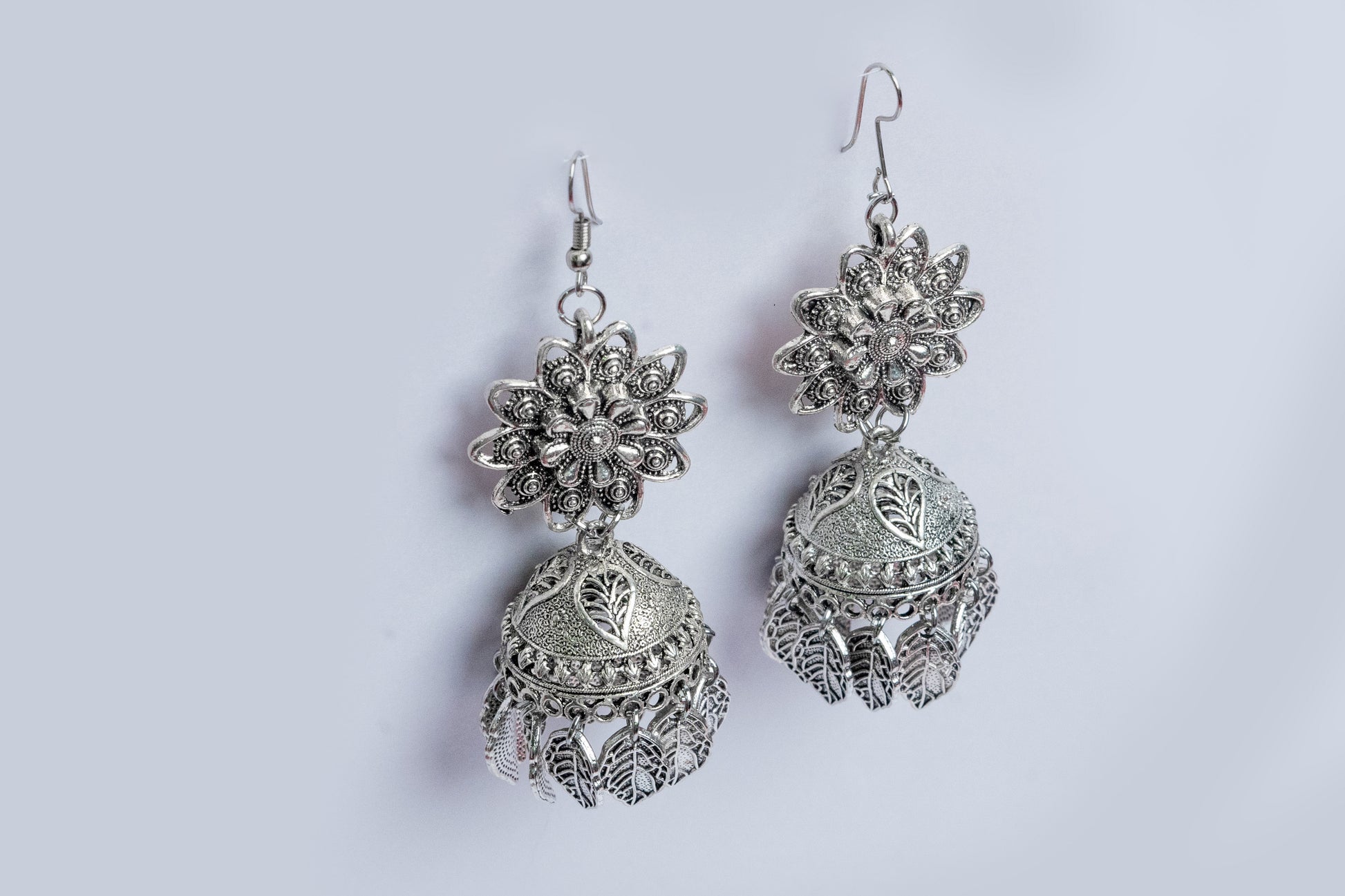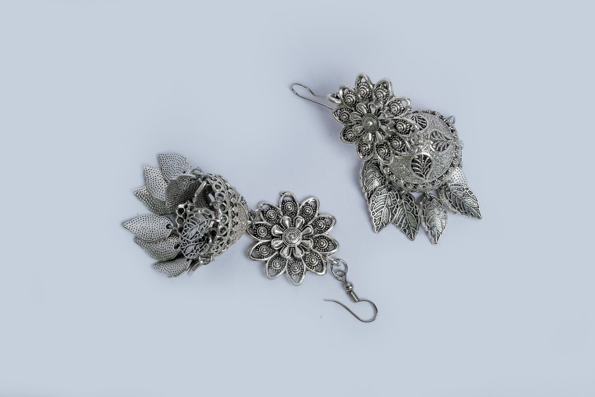 This floral Oxidised Jhumki is one of a kind with its beautifully ornate engraved details and the perfect size for a jhumka. This extraordinary jhumka is so versatile that you can add to your heavy occasion wear outfits or just uplift your everyday kurta look.