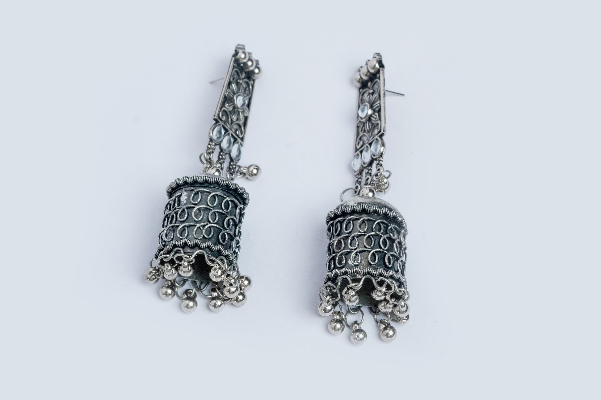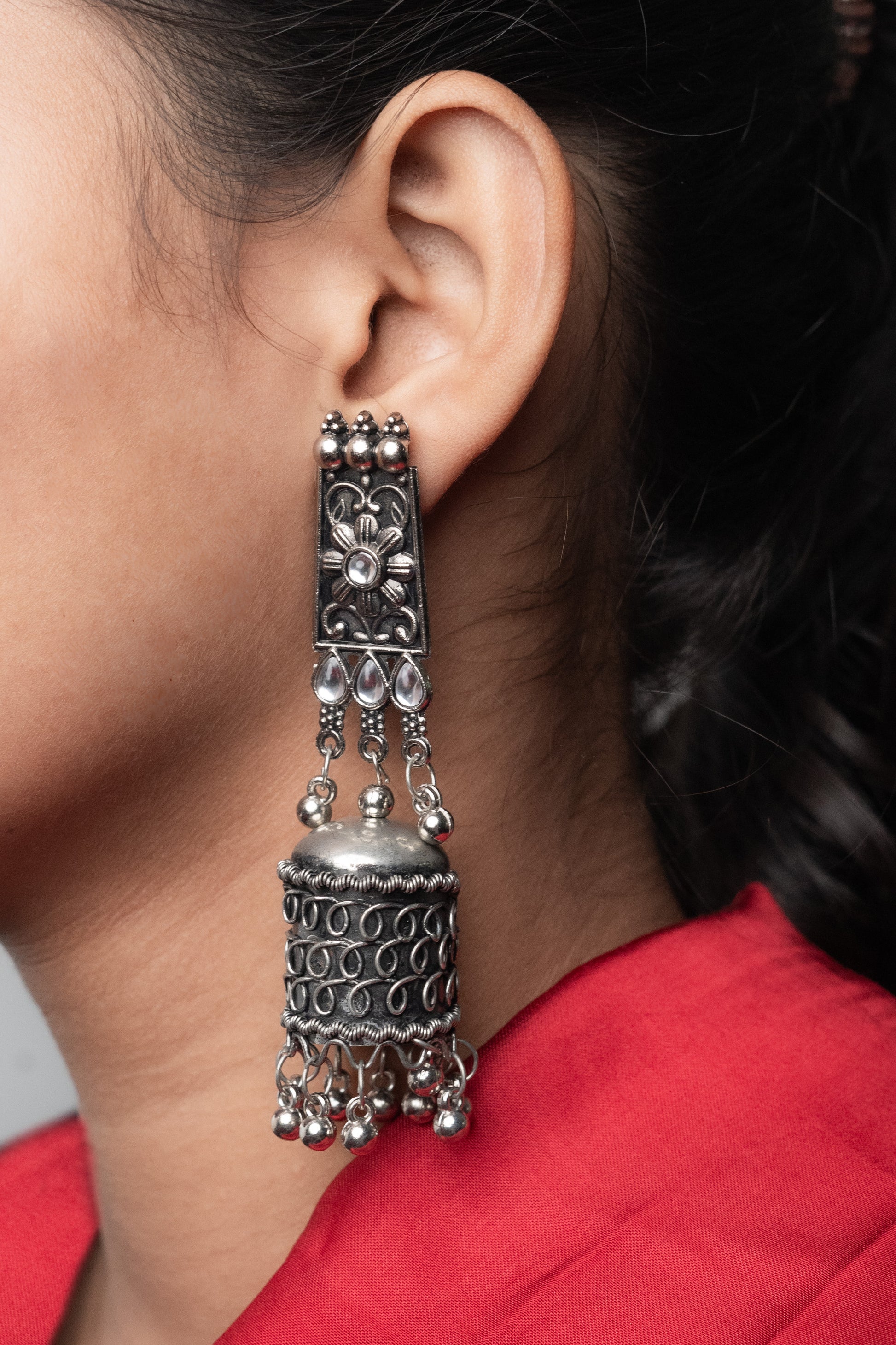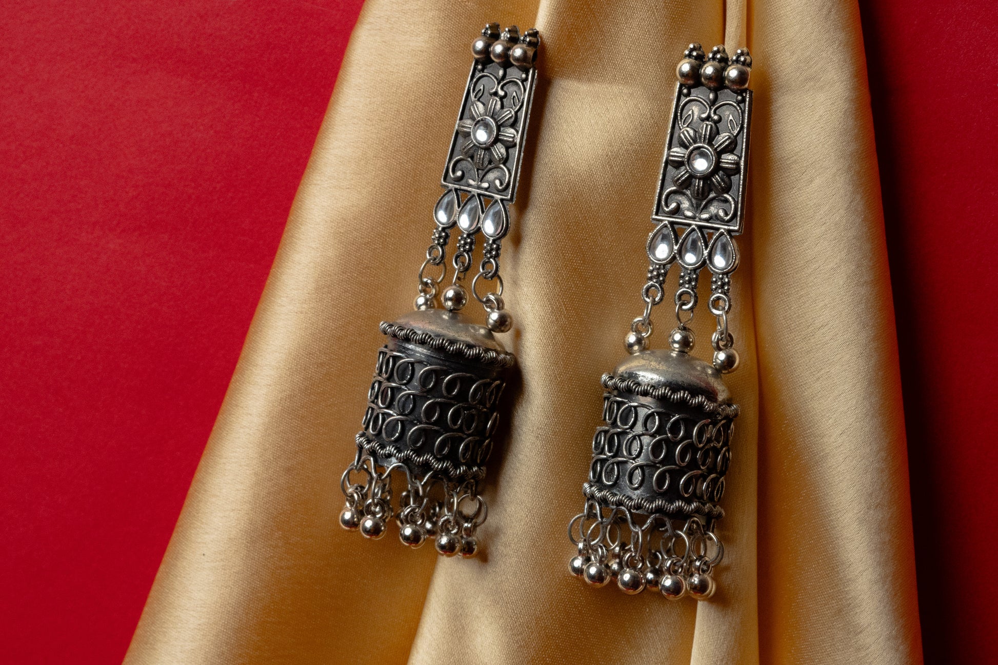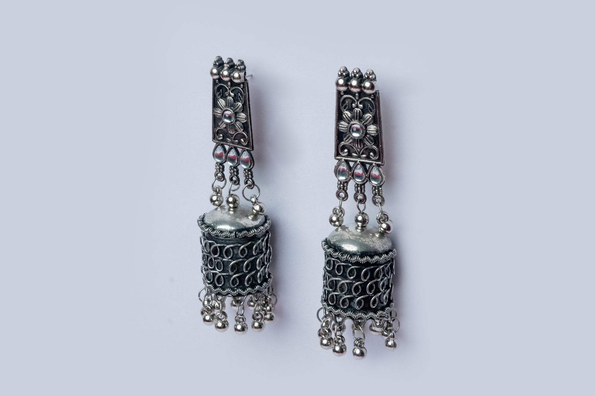 These beautiful Vomma ghungroo dangle earrings with intricate floral design are pretty lightweight to wear yet imparting the sturdiness of heavy traditional earrings. The dangling metallic beads lend a subtle charm to these dangling flower earrings which can be categorized as a suitable choice of traditional earrings for kurti , Lehengas & Sarees.