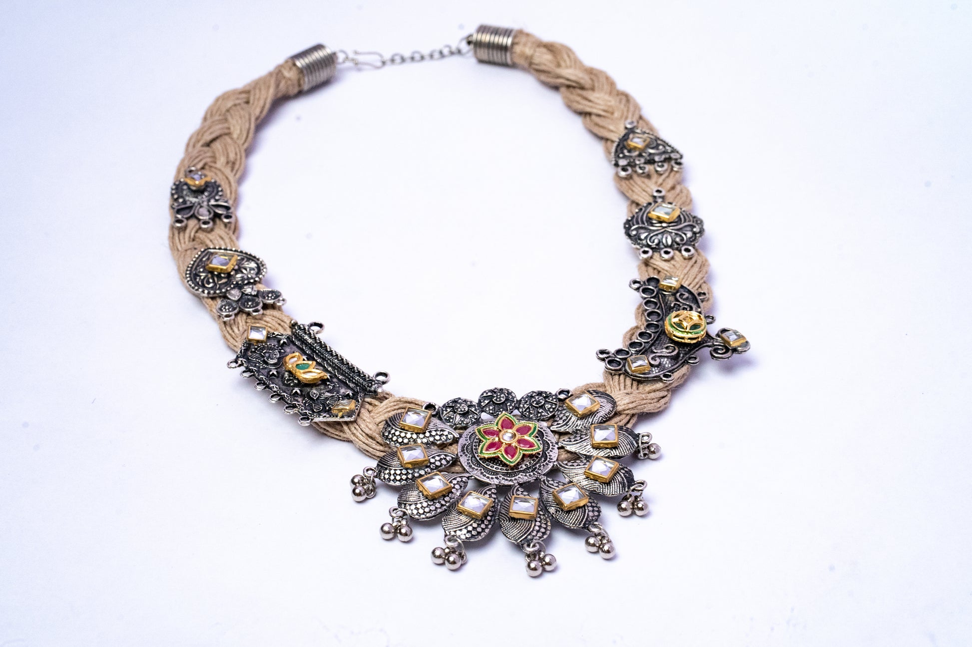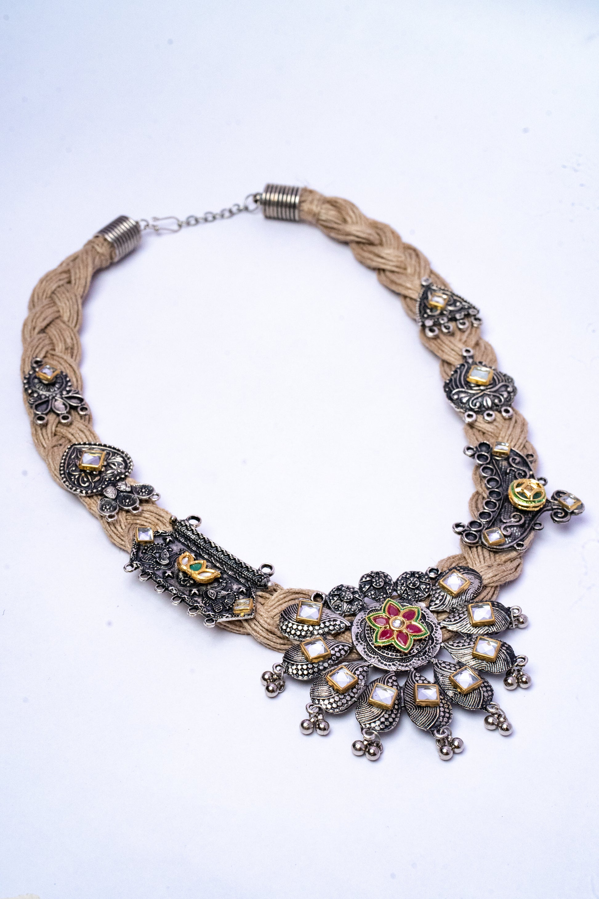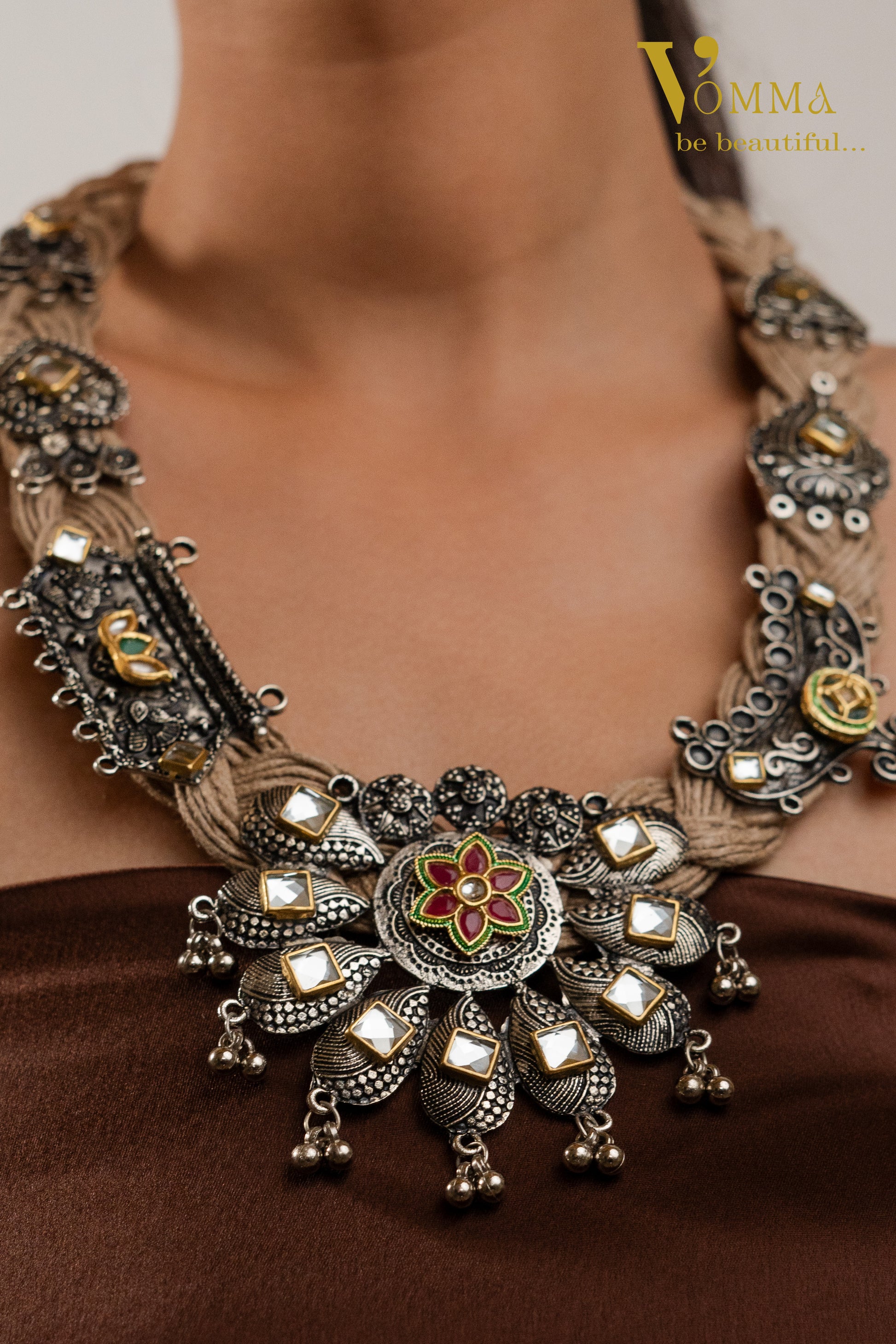 Vomma Jute Necklace is an statement piece, designed for occasions when you want to make your presence felt. Made of Jute, White Metal, Kundan & Stone, it is s timeless jewellery that stands out with its appeal & Unique Style