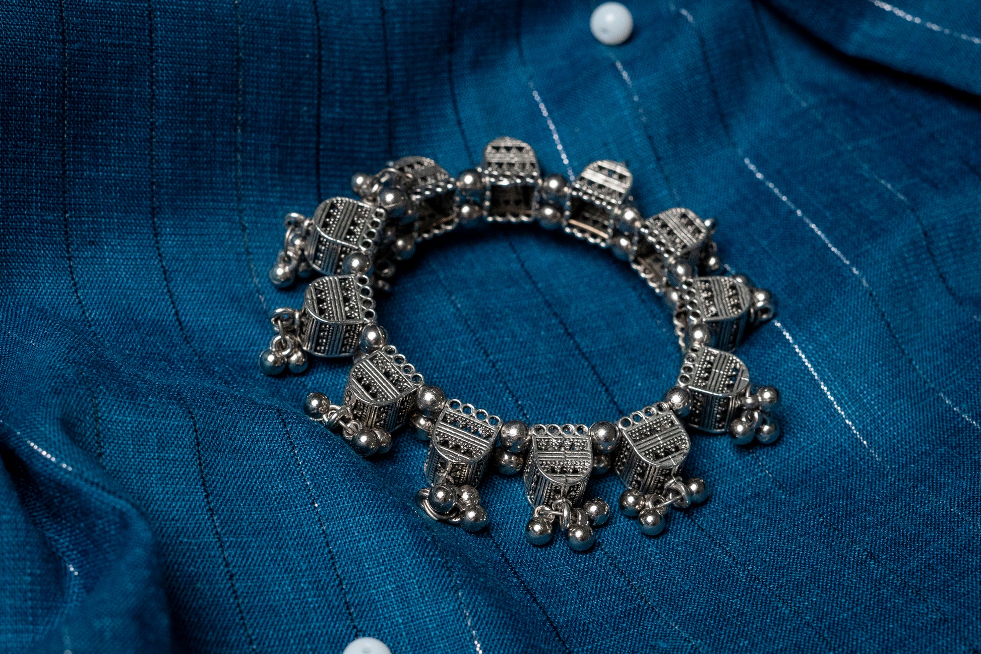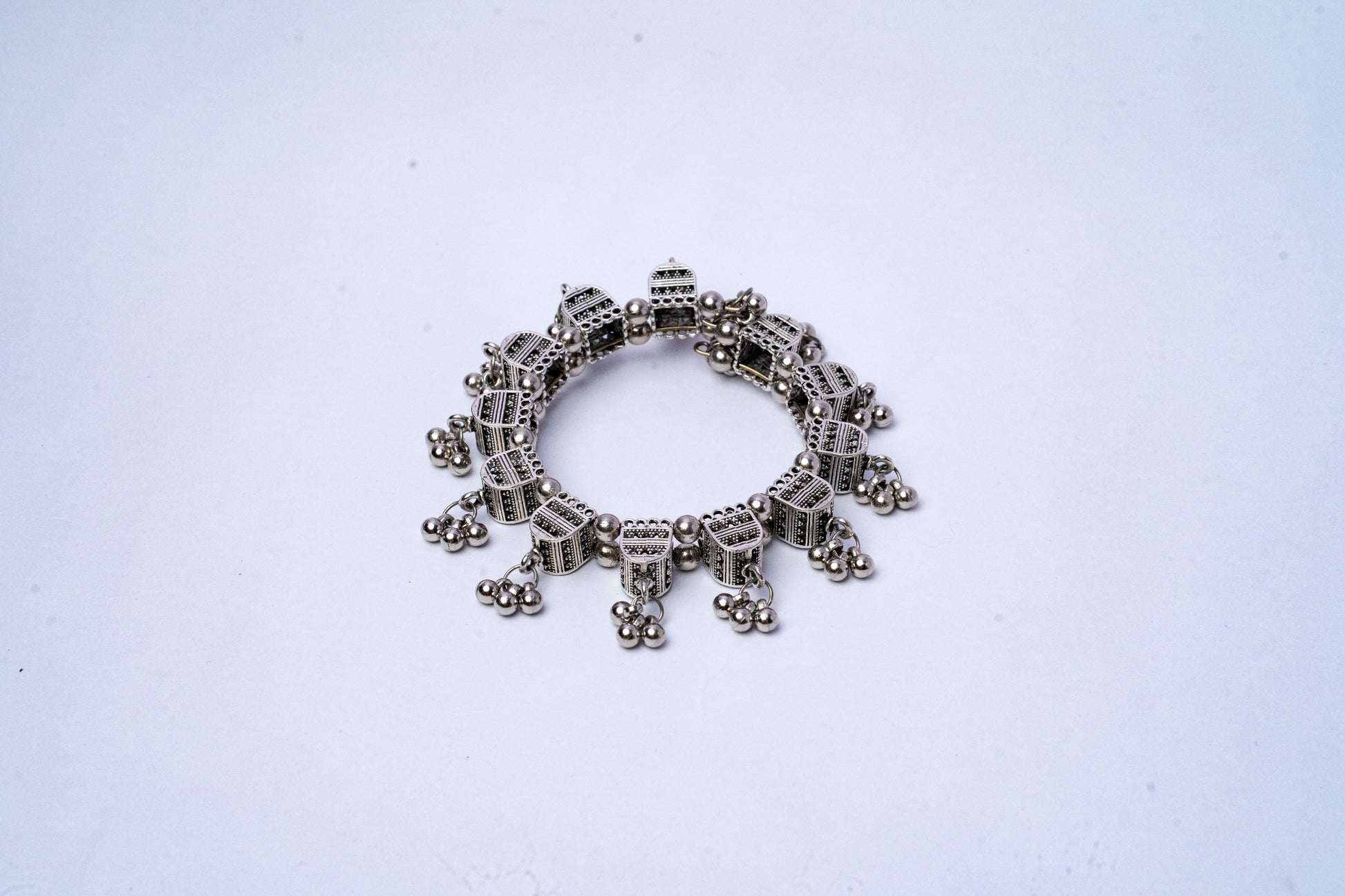 secured with a foldover closure. The dangling ghungroos adds feminity to this piece. One size fits all. Elevate the ethnic look to the next level with this bracelet.