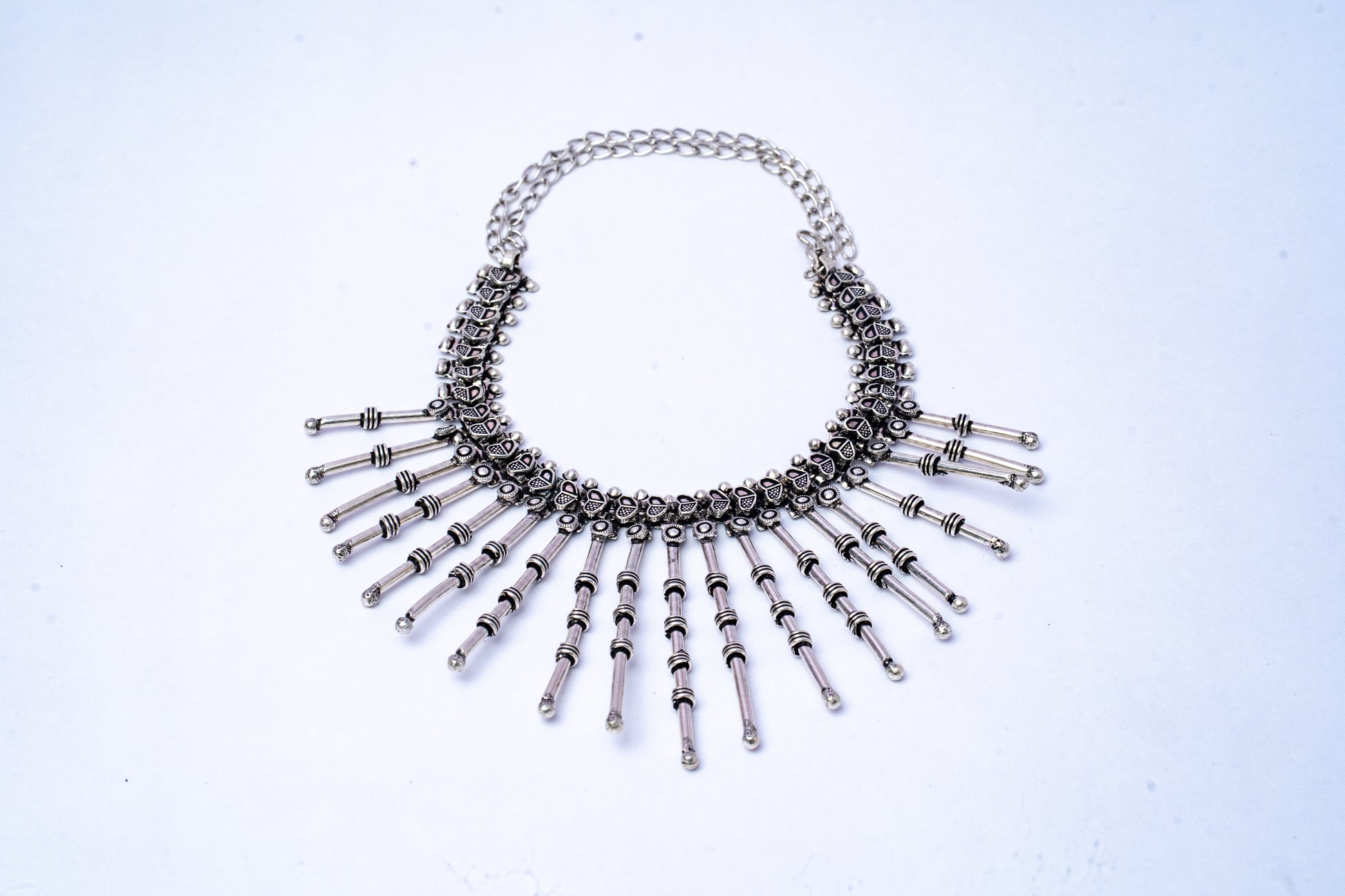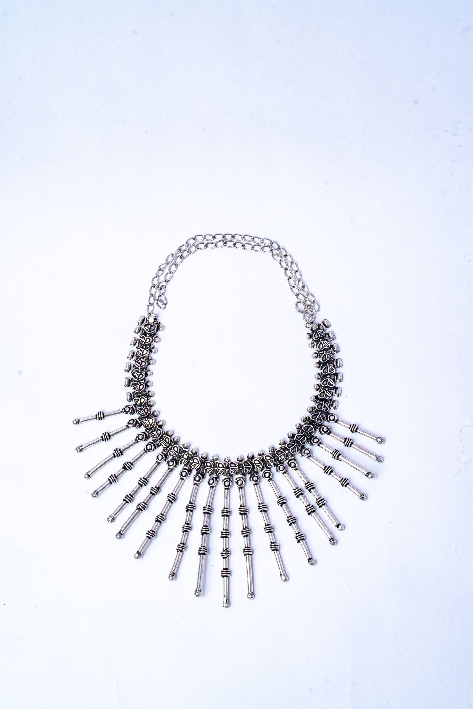 A striking collar necklace which reflects the distinct aesthetics. Experience the remarkable finish of this necklace and silver oxidised finish makes it rustic and raw. The necklace will work fabulously with your office attires and evening formals.