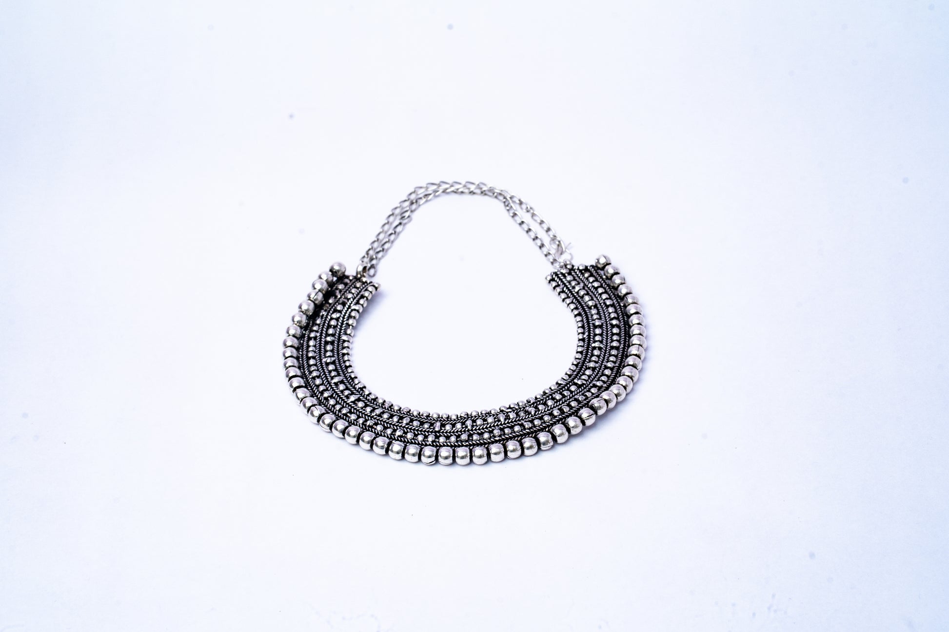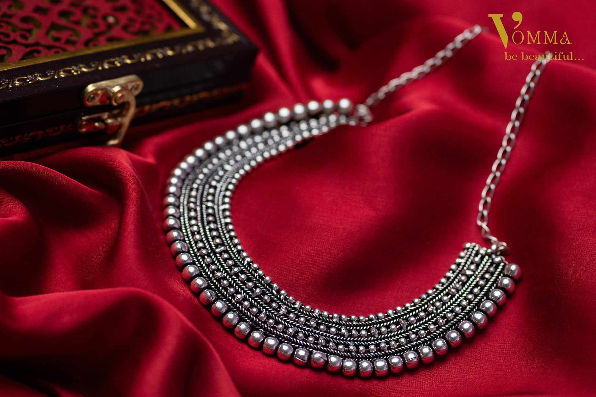 This super stylish Vomma steel beads short necklace elevates the beauty of any outfit be it saree or you are wearing a satin shirt. Grab this piece immediately.